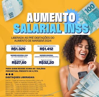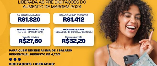 Margem do aumento confirmada. esta liberada a pré digitação do seu empréstimo consignado. Para quem recebe o bpc/loas a margem nova representa R$27,60, e para quem recebe aposentadoria ou pensão por morte a margem seria de R$32,20, e para quem recebe mais de um salário mínimo o ´percentual previsto é de 4.75%. Faça uma simulação agora mesmo através do número (91)3199-9940.